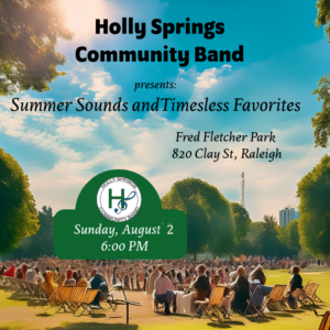 Each year, the Holly Springs Community Band enjoys the opportunity to perform outdoors at beautiful Fletcher Park as part of the City of Raleigh’s Concert in the Park Series.  Our concert this year pays tribute to the 250th birthday of America and is entitled “American Originals.”  It features music that originated in the United States such as folk songs, Dixieland, swing, jazz, and rock ‘n roll.